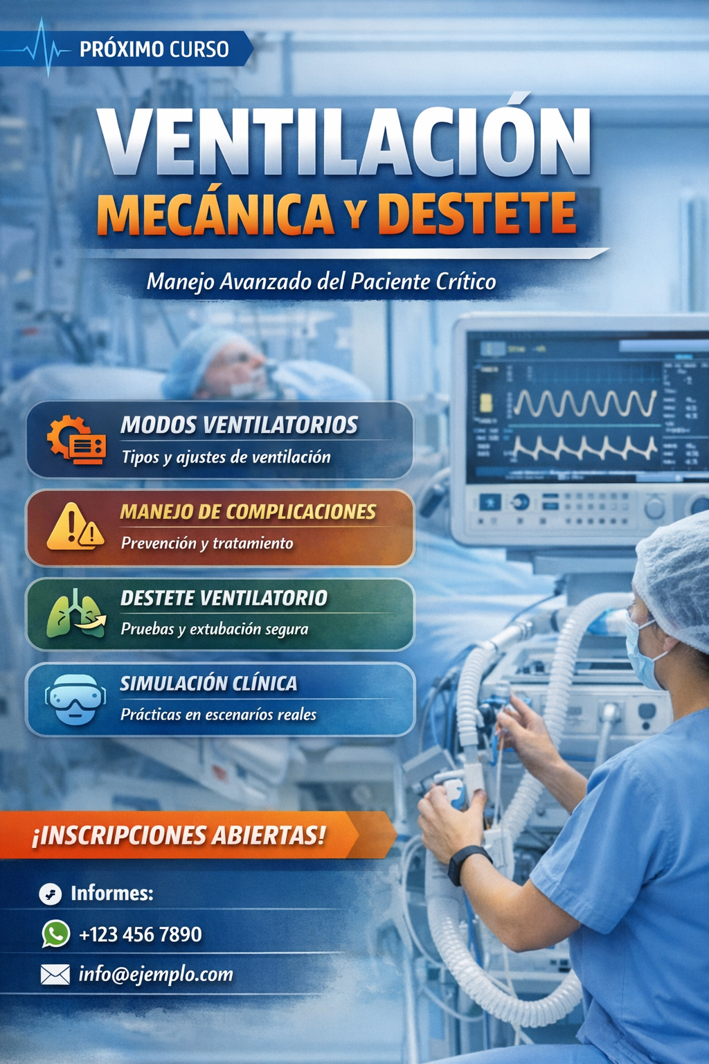 Asimismo, el curso profundiza en la identificación de indicaciones, monitoreo y complicaciones asociadas a la ventilación mecánica, promoviendo un enfoque basado en la evidencia y centrado en la seguridad del paciente.